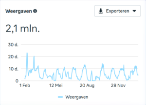 In de grafiek hieronder ziet u hoe vaak onze berichten in één jaar in beeld zijn geweest. Samen goed voor 2.1 miljoen weergaven. Iedere keer dat een bericht op het beeldscherm van iemand verschijnt, telt als één weergave.